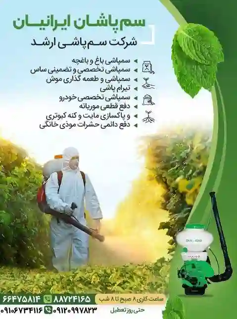 شرکت سمپاشی ایرانیان با بیش از ده سال سابقه درخشان در حوزه بهداشت و محیط و دفع حشرات و جوندگان موذی فعالیت دارد استفاده از کادر متخصص استفاده از سموم مورد تایید وزارت بهداشت و درمان دفع دائمی ساس شپش سیلور فیش کنه کبوتری کک مایت هیره سوسک مورچه موریانه و موش بدون بازگشت صدور ضمانت نامه کتبی با مهر رسمی ثبت شده