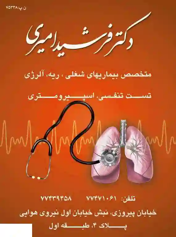 استان: تهران - شهر: تهران - منطقه 13 - محله: پیروزی - خیابان: نبش خیابان اول نیروی هوایی - کوچه: دکتر فرشید امیری - متخصص ریه - طبقه: 1 - پلاک: 4